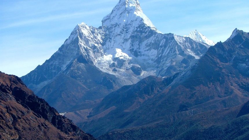 El monte Everest, situado en Nepal y el Tíbet, suele considerarse la montaña más alta de la Tierra. Con una altitud de 8848 metros (29 029 pies) en su cima, el Everest es, en efecto, el punto más elevado sobre el nivel medio global del mar, el nivel promedio de la superficie oceánica desde el cual se miden las elevaciones. Sin embargo, la cima del Everest no es el punto más alejado del centro de la Tierra.